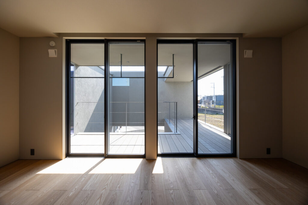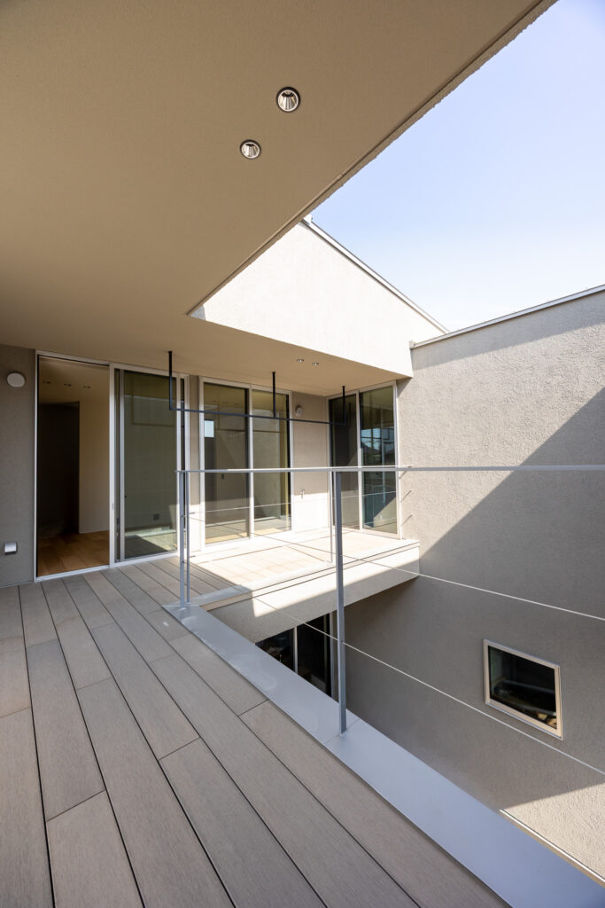 2階の各部屋はすべてウッドデッキのあるバルコニーへつながる。
