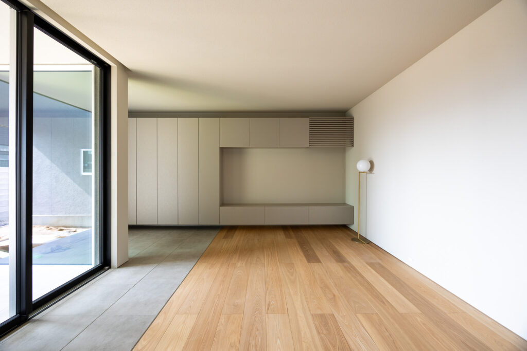玄関からリビングまでつながる収納とタイル。